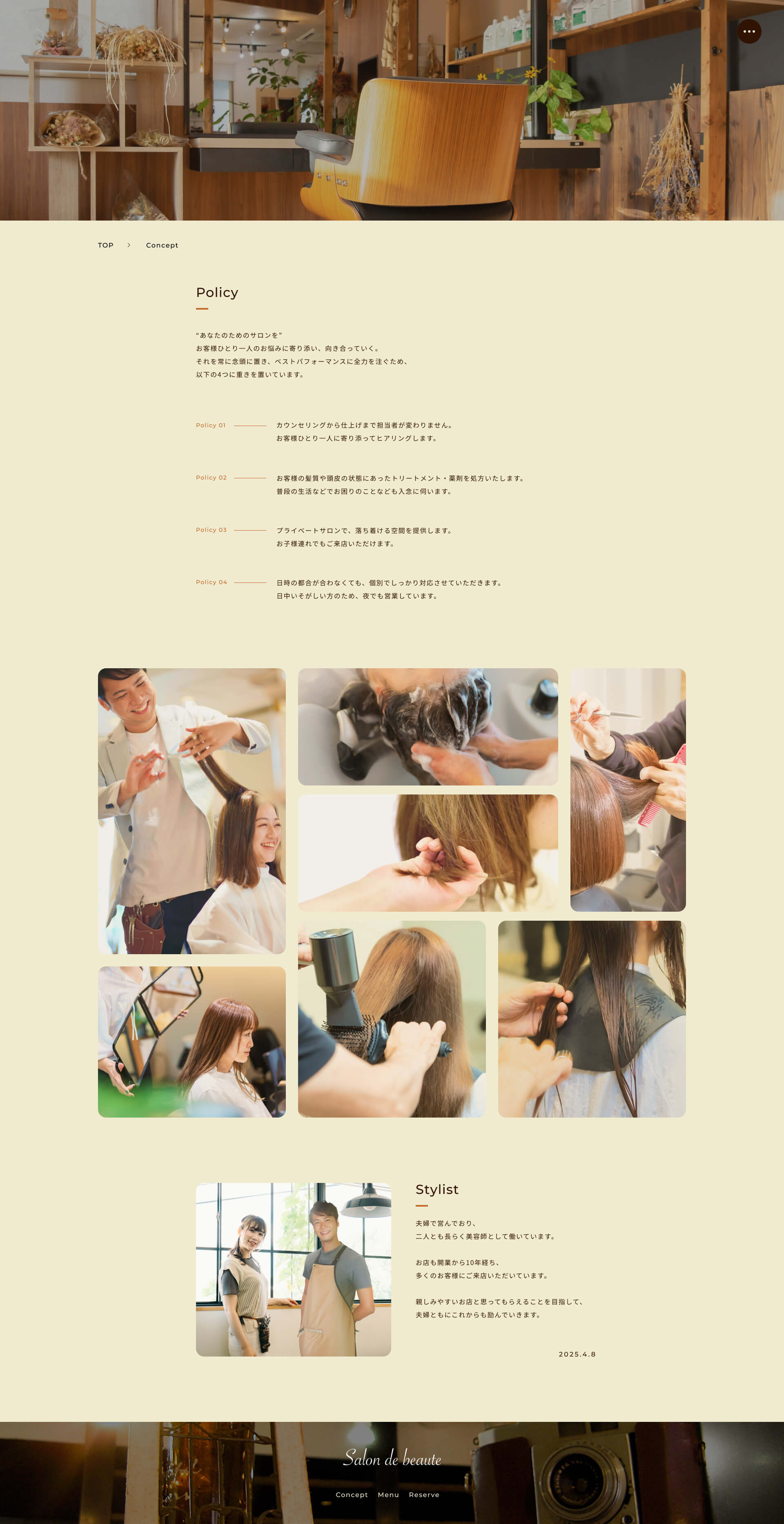 美容室のコンセプトやサービス内容をしっかりと伝えるため、下層ページを作成して情報をまとめました。